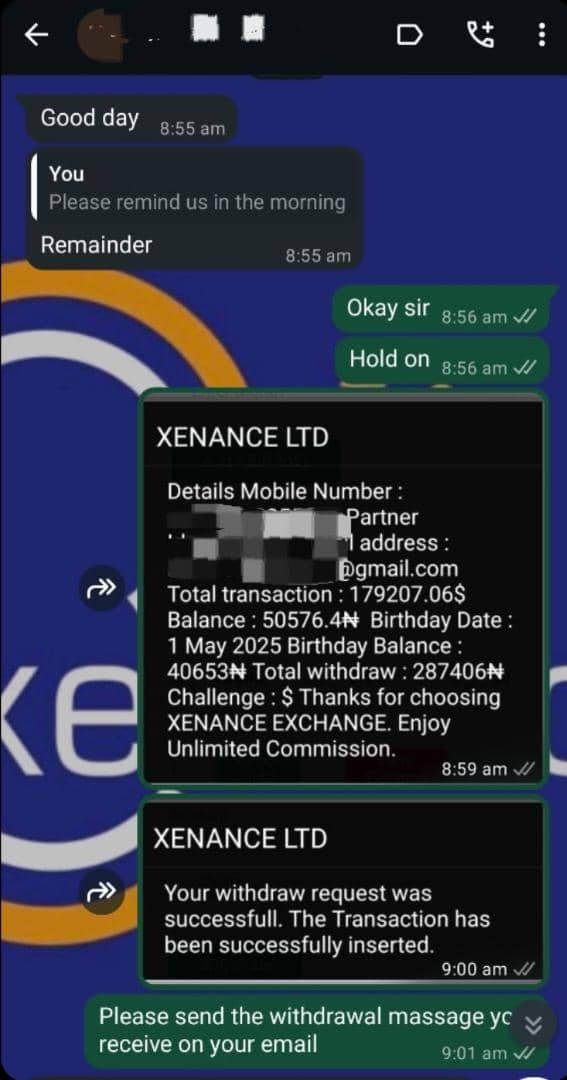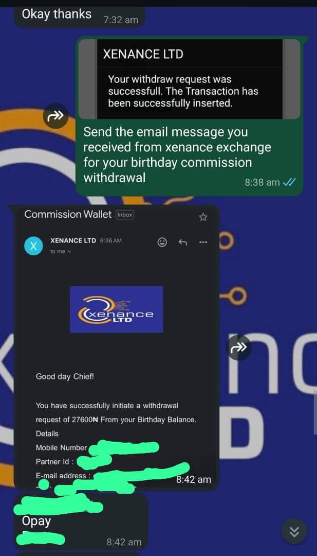 birthday reward? Xenance Exchange may store funds for customers on their birthday as part of our customer appreciation program. earn commission by referring new users?Xenance Exchange. Once your referral becomes active and trades with us, you may qualify for referral commission based on our referral guidelines. Xenance Exchange values transparency and customer trust. The screenshots displayed highlight real moments where customers successfully requested and received withdrawals from their commission earnings and birthday reward balances. All withdrawals are processed according to Xenance Exchange policies and verified requests.